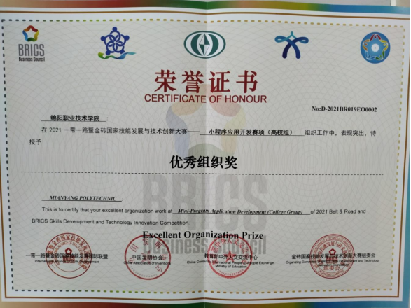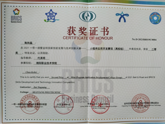 2021“一带一路”暨金砖国家技能发展与技术创新大赛web技术、python程序开发、移动应用开发大赛于2021 年 10 月 19 日至21 日在泸州职业技术学院成功举办,本次比赛吸引了来自全国70余个院校的300余名选手参加了比赛。beat365官网软件专业19级学生张佳、陈余参加web技术赛项均荣获三等奖,网络专业19级学生陈龙海参加python程序开发赛项荣获三等奖,软件专业19级学生唐兴楠、陈宜钢参加移动应用开发赛项均荣获优秀奖。