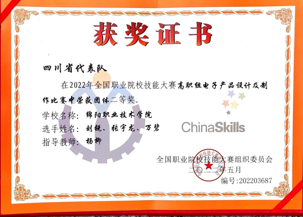 8月21日,2022年全国职业院校技能大赛(高职组)“电子产品设计及制作”赛项在烟台职业学院举行。由我院杨柳担任指导教师,杨家杰担任领队,电子信息工程技术专业刘锐、张宇龙、万碧三位同学组成的参赛团队代表四川省参加竞赛。他们与全国54所高水平的顶尖院校选手同台竞技,经过激烈角逐,勇夺该赛项二等奖。