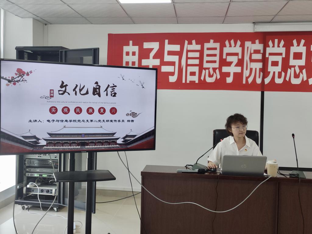 第二党支部宣传委员杨茜作《坚持文化自信,实现民族复兴》宣讲报告。杨茜以“四个意识”、“四个自信”、“两个维护”具体内涵开篇,引出“坚定文化自信”。从文化自信的重要性、文化自信的底气及如何坚定文化自信三部分具体展开,结合详尽的文化史料介绍了我国优秀的传统文化、奋发向上的革命文化以及先进的社会主义文化,要求同学们增强对“建成文化强国”远景目标的认识。最后,通过回顾习近平总书记在庆祝中国共青团成立100周年大会重要讲话,勉励同学们积极成为追求进步的模范青年,为实现中华民族伟大复兴的中国梦作出应有贡献!