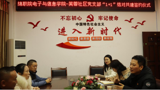 12月10日,学院党总支与芙蓉社区居委会党支部“1+1”结对共建签约暨揭牌仪式在芙蓉社区党群服务中心举行。游仙街道党工委副书记杜鹃、芙蓉社区居委会党支部书记、主任罗建斌,学院党总支书记李礁为双方结对共建签约暨揭牌。芙蓉社区党支部副书记、副主任彭波,学院专业带头人李敏教授,学院团总支负责人、指导教师代表及学生代表等参加了会议。