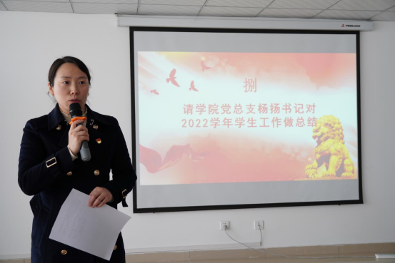 会议中,杨扬对2022年学生工作表示肯定,对全体辅导员和学生干部的努力工作表示感谢。她从爱国力行、笃实尚学、青年担当三个方面提出希望,要求全体学工人在新的一年里坚守育人初心、践行育才使命,聚焦立德树人根本任务,合力推动学院学生工作实现更高质量的发展。