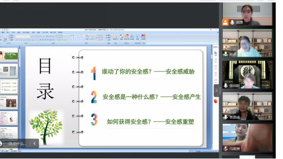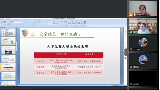 叶芹从多年教学经验出发,结合当前学生实际,以“面对当前疫情,同学们在校感受如何”为导入,引出“人类8个重要安全感”。随后从大学生的人际关系、亲子关系、恋爱关系等方面,对“安全感的概念、产生”进行了专业、细致地讲解,引导大家一起探寻获得安全感的方法,并向同学们推荐《爱的奇迹》等影视资源,拓展课堂内容,加深同学们对“安全感”的理解。团辅过程中环环相扣的精妙设计,极大地调动了同学们的参与热情,突破了“屏对屏”的障碍,让学生感到安心、舒心、暖心。